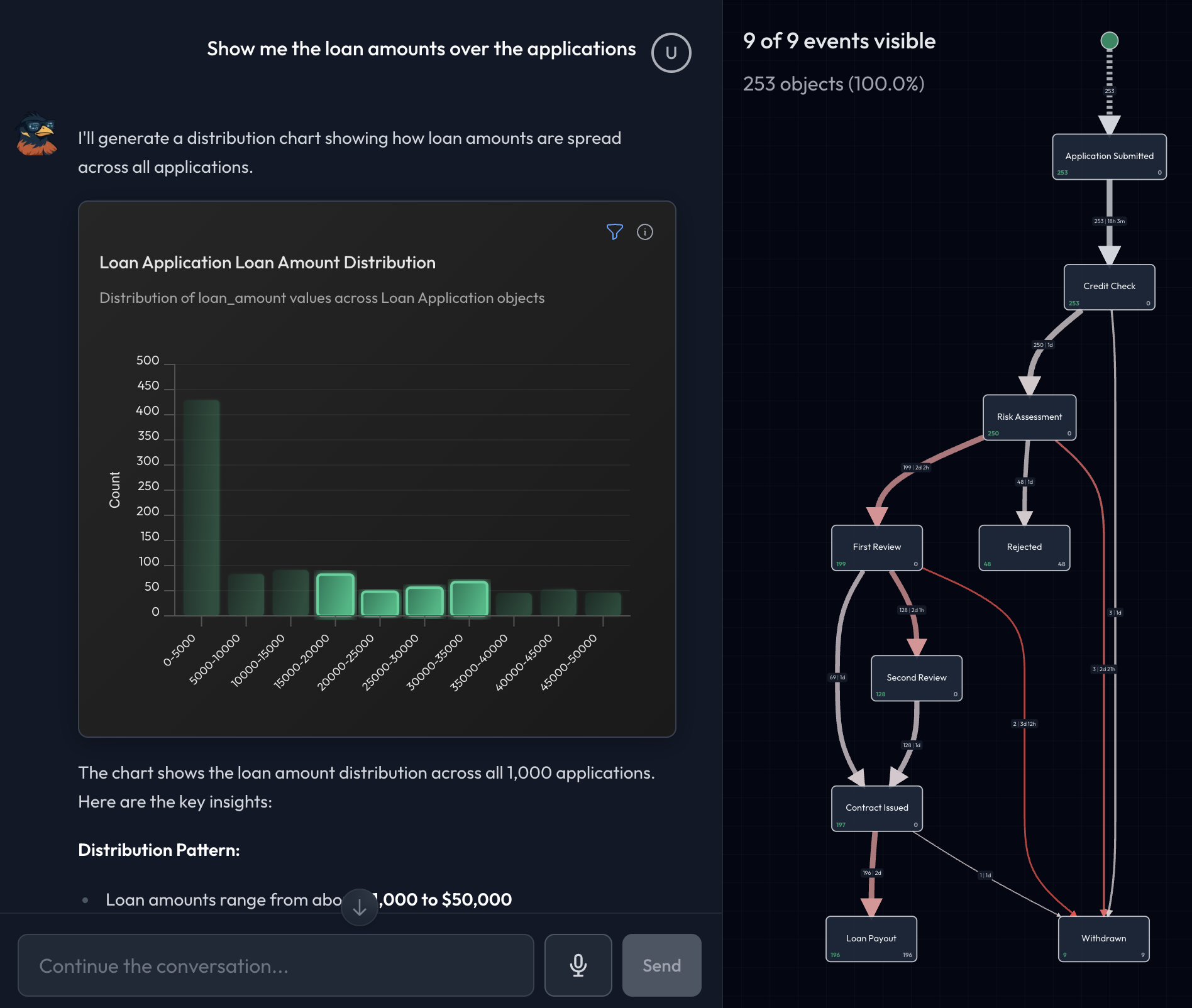 The AI Co-Pilot is your conversational assistant for process exploration. Ask questions in natural language and get instant answers with automatic filters, visualizations, and insights. No SQL, no complex queries—just natural conversation.