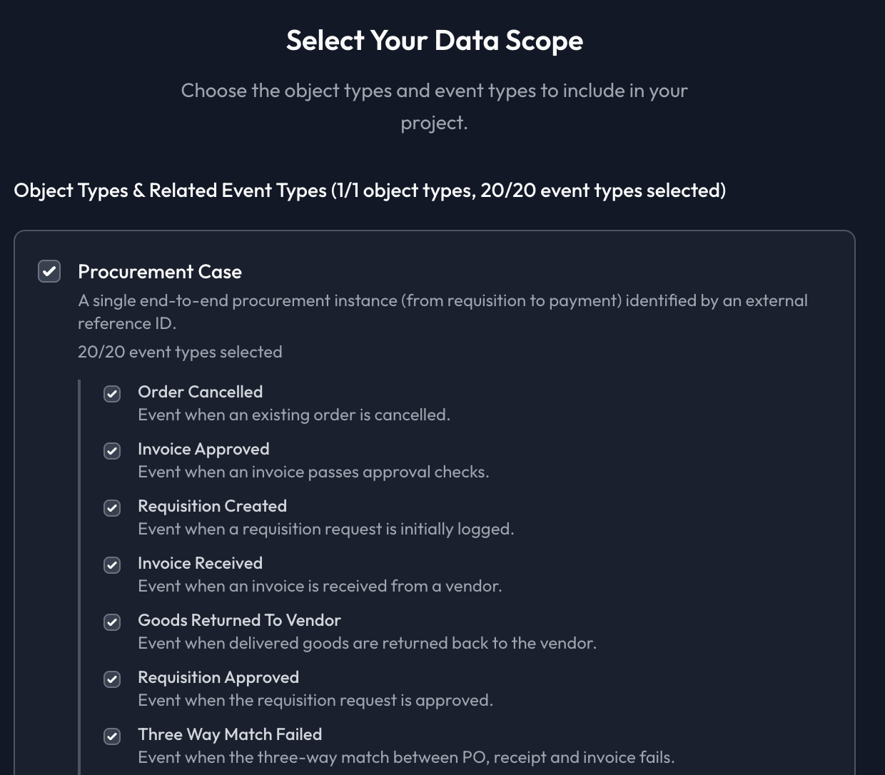 Projects are focused analysis workspaces where you explore specific aspects of your process data. Each project lets you select which objects and events to analyze, keeping your analysis focused and performant.
