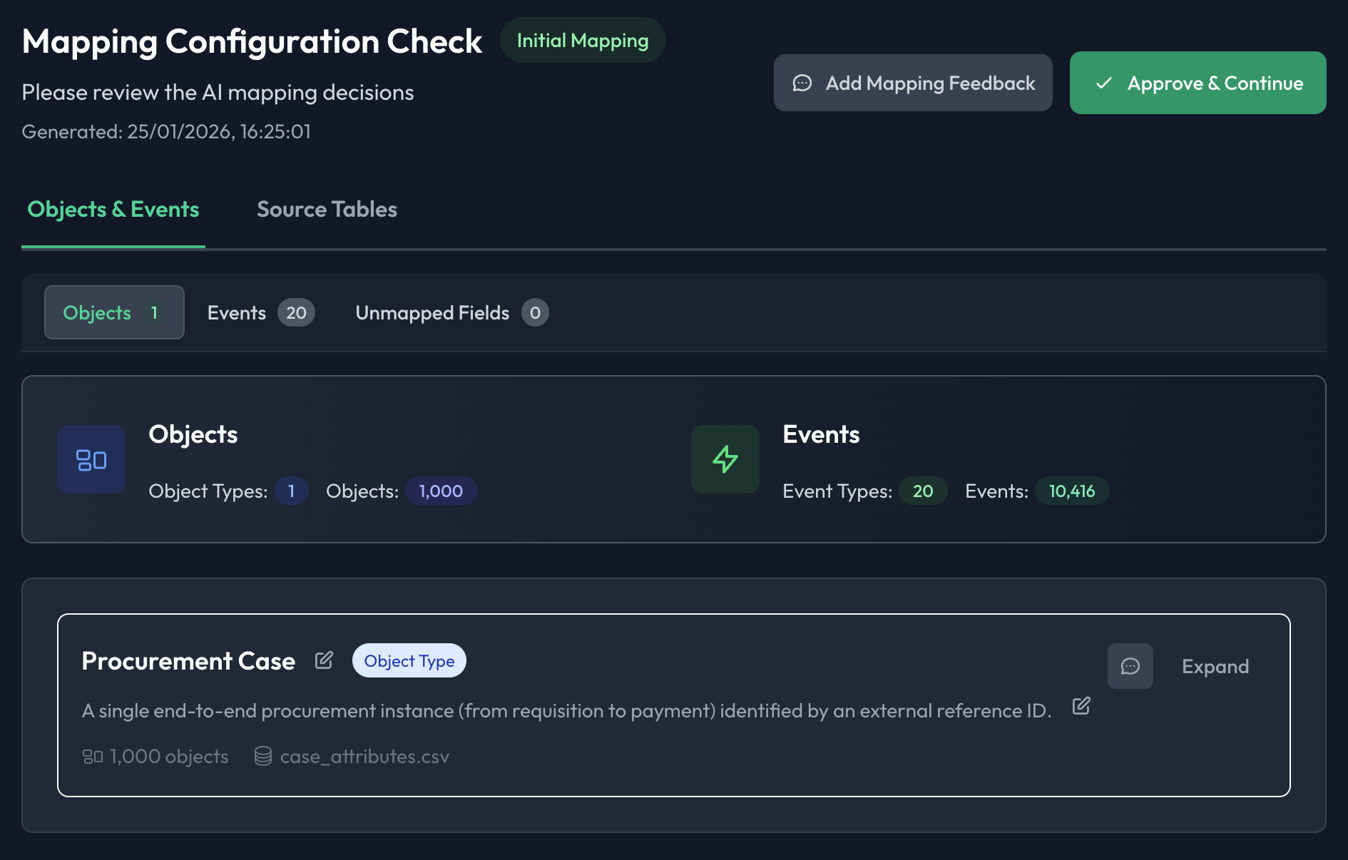 The key advantage: Our AI agents do the heavy lifting of understanding your data structure, identifying objects and events, and creating the right relationships. You just verify their work and make any needed adjustments.