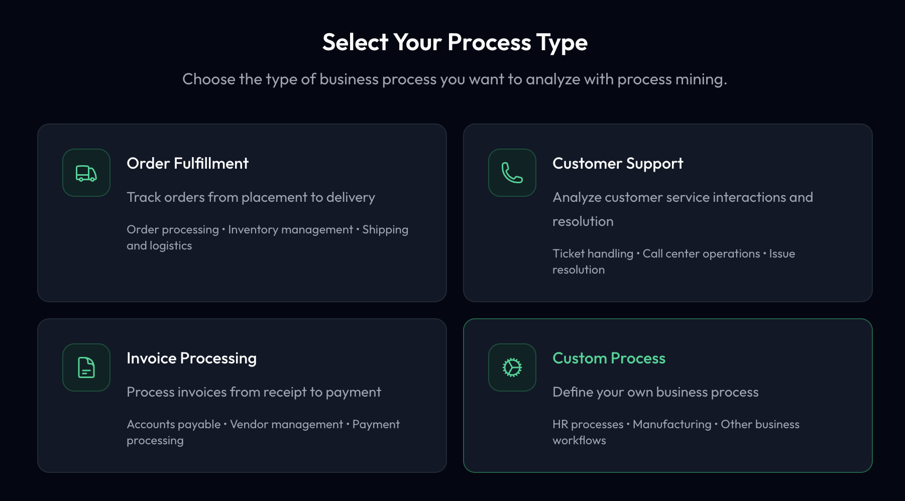 Why this matters: The process type helps the AI understand your data context. Don't worry too much about picking the "perfect" type—the AI adapts to your actual data structure regardless.